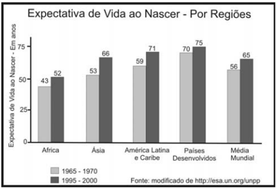 a) Indique a(s) região(ões) do globo com taxa de esperança de vida ao nascer inferior à média mundial, nos intervalos 1965-1970 e 1995-2000. Indique a região representada no gráfico com o melhor desempenho no aumento de expectativa de vida ao nascer entre os períodos 1965/1970 e 1995/2000.