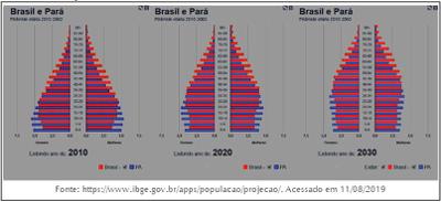 Os gráficos das pirâmides etárias do Estado do Pará dos anos de 2010, 2020 e projeção para 2030, refletem a seguinte dinâmica populacional: