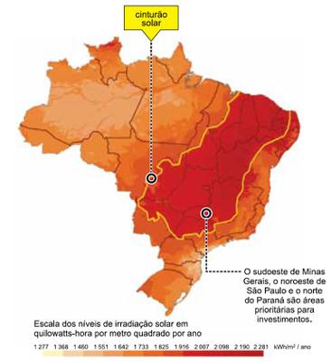 O Atlas Brasileiro de Energia Solar recomenda investimentos em novas plantas de geração de energia solar no sudoeste de Minas Gerais, no noroeste de São Paulo e no norte do Paraná, embora elevados níveis de irradiação sejam encontrados no Nordeste do país. Essa aparente contradição é refutada por haver