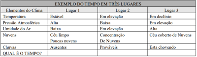 Observe que nas previsões meteorológicas (do tempo) são usadas expressões: tempo bom; instável ou chuvoso. Essas expressões nos dão à ideia da combinação dos elementos do clima, num dado momento. Na tabela abaixo foram considerados três lugares (1, 2 e 3) e foi feito uma combinação dos elementos do clima em cada lugar.