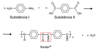 Esse polímero é produzido por uma reação cujo mecanismo é semelhante àquele da produção do Nylon®. Essa reação é representada na equação a seguir.