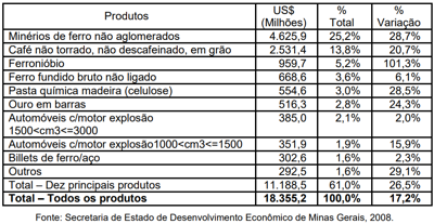 Para Minas Gerais, têm-se os seguintes dados sobre as exportações: