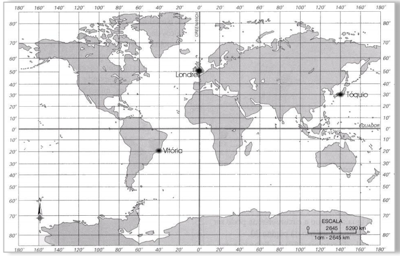 Para facilitar a comunicação entre os diversos pontos do planeta, convencionou-se um sistema de fusos horários, baseado nos meridianos. Considerando estes fusos horários mundiais, quando for 14h do dia 25 de dezembro de 2011, na cidade de Londres, na Inglaterra, será 11h na cidade de Vitória, no Brasil, e 23h na cidade de Tóquio, no Japão.