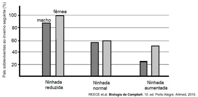 Pesquisadores holandeses estudaram durante cinco anos os efeitos do cuidado parental em falcões da Eurásia. Eles transferiram filhotes entre os ninhos para produzir ninhadas reduzidas (3 ou 4 filhotes), ninhadas normais (5 ou 6) e ninhadas aumentadas (7 ou 8). Em seguida, eles mediram a porcentagem de pais machos e fêmeas que sobreviveram ao inverno seguinte. Tanto os machos quanto as fêmeas cuidam dos filhotes. Os resultados estão apresentados no gráfico a seguir.