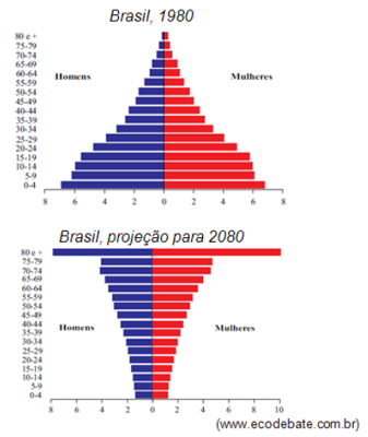 Pirâmide etária é um gráfico organizado para classificar a população de uma determinada localidade conforme as faixas de idade, dividindo-as por sexo. As pirâmides da figura abaixo apresentam a estrutura etária da população brasileira em 1980 e a sua projeção para 2080.