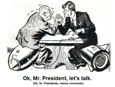 A charge representa um dos momentos mais críticos da história contemporânea: o conflito dos mísseis em Cuba. Mostra o primeiro ministro russo, Nikita Kruschev, e o presidente americano, John Kennedy, em uma queda de braço, simbolizando o momento em que a guerra-fria se desloca das fronteiras da Europa para América. O conflito impunha uma nova realidade aos pactos militares tratados na Europa e reacendia a tensão de um conflito nuclear. Com base nesse contexto, responda: