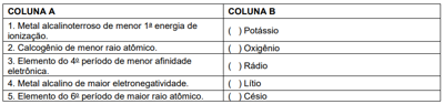 Numere a coluna B de acordo com a coluna A, relacionando os grupos de alguns átomos às suas propriedades periódicas. Depois, marque a alternativa CORRETA: