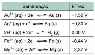 Considere uma situação em que seja necessário proteger da corrosão um encanamento de ferro enterrado em solo ácido, e que estejam disponíveis placas dos metais ouro, prata e magnésio para eventual utilização como metais de sacrifício. Na tabela a seguir são fornecidos os valores dos potenciais padrão de redução dos pares redox que podem eventualmente estar envolvidos na proteção catódica desse encanamento.