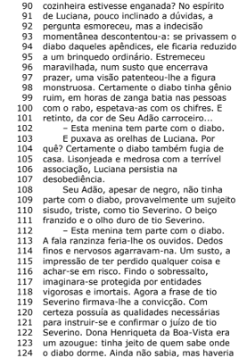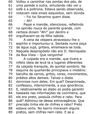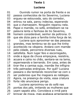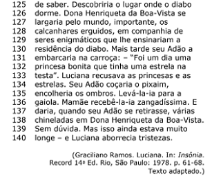 Releia com atenção o trecho que fica entre as linhas 17 e 23: “Em casa, antes de tirar-lhe a camisa suja, mamãe lhe infligira três palmadas enérgicas. Por quê? Luciana passara o dia tentando reconciliar-se com o ser poderoso que lhe magoara as nádegas. Agora, na presença da visita, essa criatura forte não anunciava perigo”. Nesse trecho aparecem três vocábulos e/ou expressões que se referem à mãe de Luciana. São expressões referenciais, com as quais podem ser construídas quatro diferentes sequências. Uma delas foi organizada de modo a formar uma gradação ascendente com um forte clímax. Essas expressões referenciais são responsáveis pelas mudanças que o referente sofre durante o desenvolvimento do discurso. A sequência que expressa a gradação ascendente é