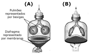 01) O movimento de inspiração está representado pelo esquema (A). A contração do diafragma e dos músculos intercostais determina o aumento do volume da caixa torácica e diminuição da pressão interna, ocasionando a entrada de ar nos pulmões.