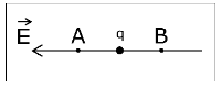 04) Numa região onde existe um campo elétrico uniforme, conforme figurado abaixo, abandona-se, em repouso, no ponto A, uma partícula de carga elétrica q = –5e. Sendo o módulo do campo elétrico igual a 5 N/C e a distância entre os pontos A e B igual a 40 cm, pode-se afirmar que quando a partícula atingir o ponto B, sua energia cinética será igual a 10 eV.