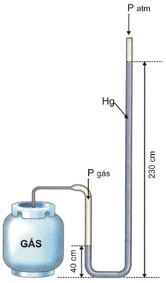 O manômetro é um aparelho que serve para medir a pressão de um gás. Ele consiste em um tubo em forma de U, aberto nas duas extremidades, contendo em seu interior Hg, conforme ilustrado na figura abaixo. Uma das extremidades está conectada à válvula de saída de gás do botijão. Com relação ao funcionamento desse manômetro, analise as alternativas abaixo e assinale o que for correto.