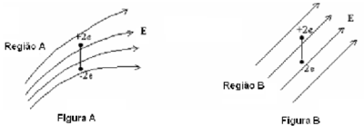 (001) O dipolo elétrico, que está na região B, não sofrerá torque devido às forças elétricas, porque o campo elétrico em que está imerso é uniforme.
