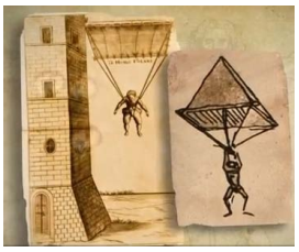 08. Fatos históricos relatam que o ícone da Renascença, Leonardo da Vinci, no século XV, idealizou uma espécie de paraquedas. O protótipo teria o formato de uma pirâmide regular de base quadrangular, como mostra a figura. Recentemente, recriaram o modelo, construindo uma pirâmide com o mesmo formato, cujas arestas medem 6 m. Portanto, para fechar as laterais, usaram 36 √3 m² de material.