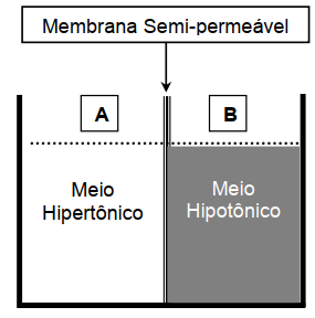Dentre os vários mecanismos de transporte em nível de membrana celular, podemos citar a osmose. De maneira simplificada, a figura abaixo esquematiza as condições para a ocorrência da osmose.