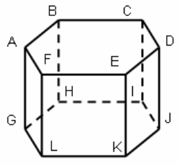 Na figura a seguir está ilustrado um prisma reto regular hexagonal, de faces laterais quadradas e de vértices A, B, C, D, E, F, G, H, I, J, K e L.