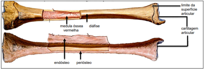 Os ossos são estruturas muito resistentes e também elásticas e têm importantes funções no nosso organismo, como a de sustentação. Na figura abaixo, são mostradas as partes principais de um osso longo humano.