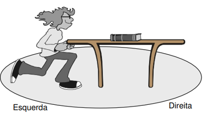 , da esquerda para a direita, movimentando-a neste sentido. Um livro solto sobre a mesa permanece em repouso em relação a ela.