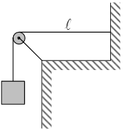 São de 100 Hz e 125 Hz, respectivamente, as frequências de duas harmônicas adjacentes de uma onda estacionária no trecho horizontal de um cabo esticado, de comprimento 𝓁 = 2 m e densidade linear de massa igual a 10 g/m (veja figura). Considerando a aceleração da gravidade g = 10 m/s², a massa do bloco suspenso deve ser de: