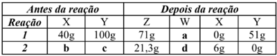 Sabendo-se que uma substância X reage com uma substância Y produzindo as substâncias Z e W, e considerando as duas reações descritas no quadro a seguir, realizadas sob as mesmas condições, assinale o que for correto.