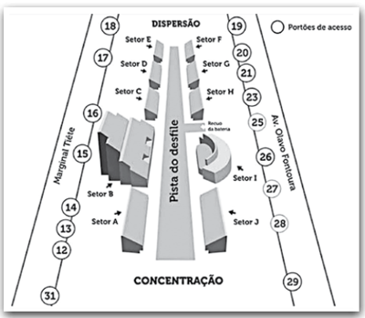No Grupo Especial, cada escola de samba deve percorrer toda a extensão dessa pista, desde a entrada do seu primeiro integrante na concentração até a saída do seu último componente na dispersão, em tempo máximo determinado de 65 minutos.