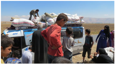 Un autobús procedente de Siria llega al asentamiento. Transporta refugiados y los bienes que han podido traer con ellos. / NURIA BERRO (ACCIÓN CONTRA EL HAMBRE)