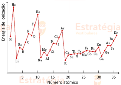 O gráfico abaixa mostra como a energia de ionização varia ao longo da Tabela Periódica.