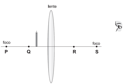 Tânia observa um lápis com o auxílio de uma lente, como representado nesta figura: