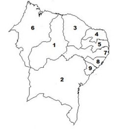 Tendo como base a figura que representa o território do Nordeste, assinale a alternativa que traz informações corretas quanto ao número indicado.