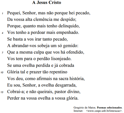 Tendo como referência o poema de Gregório de Matos acima apresentado, julgue o item a seguir.