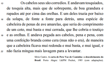 Na linha 20, a oração “mas não o era” expressa uma oposição em relação à possibilidade de a cabeleira de penas que um dos habitantes do novo mundo trazia ser de “confeição branda como cera”. Na organização da informação do texto, a referida oração consiste em um comentário considerado relevante por parte de Caminha.