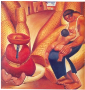 Observando lo representado en el lienzo del artista ecuatoriano, Bolívar Mena Franco, y dando atención a su título, Venta de esteras, se identifica a: