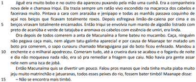 Em “Mandou a enchente e o milharal apodreceu.” (linhas 9 e 10), entende-se que a enchente foi mandada por Maanape, feiticeiro.