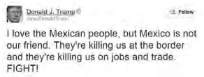 Tradução livre: Eu amo o povo mexicano, mas o México não é nosso amigo. Eles estão nos matando na fronteira, nos postos de trabalho e nas disputas comerciais.