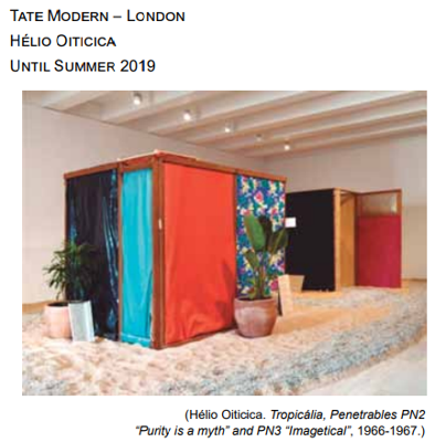 The word Tropicália comes from an installation by the artist Hélio Oiticica, who created environments that were designed to encourage the viewer’s emotional and intellectual participation. Oiticica called them “penetrables” because people were originally encouraged to enter them. They mimic the improvised, colourful dwellings in Rio de Janeiro’s favelas, or shanty towns. The lush plants and sand help to convey a sense of the tropical character of the city. When Oiticica exhibited the work, he also included live parrots.