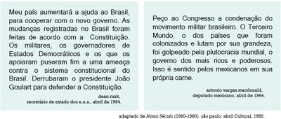 Considerando a natureza do movimento que depôs o presidente brasileiro em 1964, identifique a principal diferença entre o posicionamento do secretário de Estado norte-americano e o do deputado mexicano. Em seguida, apresente um aspecto do contexto internacional da época que explique o posicionamento dos E.U.A.