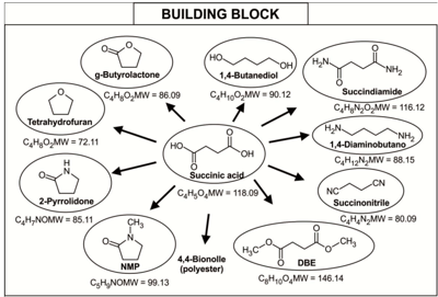 O ácido succínico (succinic acid) é o ácido orgânico de maior potencialidade com uma variedade de aplicações industriais. É um produto de grande interesse para empresas de vários segmentos, por ser um building block, precursor de muitos produtos químicos importantes industrialmente, como mostra o esquema a seguir.