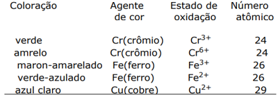 Os “agentes de cor”, como o próprio nome sugere, são utilizados na indústria para a produção de cerâmicas e vidros coloridos. Tratam-se, em geral, de compostos de metais de transição e a cor final depende, entre outros fatores, do estado de oxidação do metal, conforme mostram os exemplos na tabela a seguir.