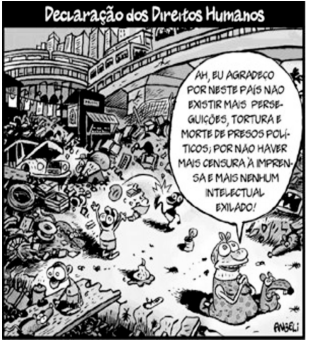 A análise da charge e os conhecimentos sobre a história dos direitos humanos, no Brasil, permitem afirmar que a personagem se refere a uma situação de exceção característica do período do governo