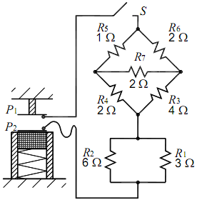 A figura apresenta uma placa positiva metálica P₁, de massa desprezível, fixada no teto, que dista 10 cm de uma placa idêntica P₂. Ambas constituem um capacitor de 16 pF, carregado com 32 pC. A placa P₂ está colada em um bloco de madeira com massa m = 1 kg, mantido em repouso, encostado sobre uma mola não comprimida. Libera-se o movimento do bloco e, no instante que a compressão da mola é máxima, fecha-se a chave S. Sabe-se que nesse instante a potência dissipada em R₂ é 2/3 W e que a aceleração da gravidade g = 10 m/s². A constante da mola, em N/m, é
