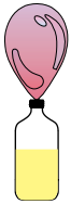 Na apresentação de um projeto de química sobre reatividade de produtos caseiros, vinagre e bicarbonato de sódio (NaHCO₃) foram misturados em uma garrafa plástica; em seguida, uma bexiga vazia foi acoplada à boca da garrafa. A imagem apresenta o momento final do experimento.