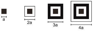 Uma artesã fabricou um tapete bicolor formado por quadrados concêntricos. Ela começou com um quadrado preto de lado α centímetros. Em seguida, costurou tecido branco em volta do preto de forma a ter um quadrado de lado 2α concêntrico ao inicial. Continuou o processo alternando tecido preto e branco conforme a figura abaixo: