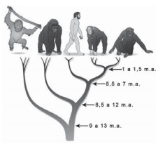 A árvore filogenética representa uma hipótese evolutiva para a família Hominidae, na qual a sigla "m.a." significa "milhões de anos atrás". As ilustrações representam, da esquerda para a direita, o orangotango, o gorila, o ser humano, o chimpanzé e o bonobo.