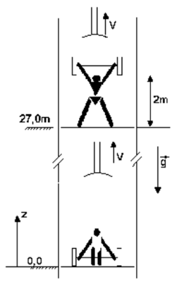 Um atleta está dentro de um elevador que se move para cima com velocidade constante V. Ele começa a levantar uma massa de 100 kg, inicialmente apoiada no piso do elevador, quando este passa pela altura z= 0,0m, e termina quando o piso do elevador passa por z= 27,0m. A massa é levantada pelo atleta até uma altura de 2,0m acima do piso do elevador. O trabalho realizado pelo atleta sobre a massa é W. A variação da energia potencial da massa durante o levantamento, em relação ao referencial da Terra, é AU. Podemos afirmar, usando g = 10 m/s², que