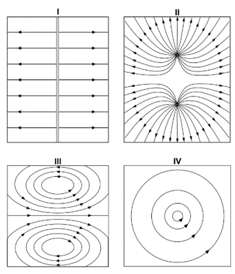 Em uma aula de laboratório, os estudantes foram divididos em dois grupos. O grupo A fez experimentos com o objetivo de desenhar linhas de campo elétrico e magnético. Os desenhos feitos estão apresentados nas figuras I, II, III e IV abaixo.