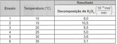 Em uma aula prática de bioquímica, para medir a atividade catalítica da enzima catalase, foram realizados seis ensaios independentes, nas mesmas condições, variando-se apenas a temperatura. A catalase decompõe o peróxido de hidrogênio (H₂0₂), produzindo água e oxigênio. Os resultados dos ensaios estão apresentados no quadro.