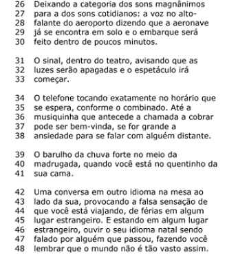 A autora da crônica cria duas categorias para classificar os sons com que nos deparamos no dia a dia: sons magnânimos e sons cotidianos. Leia os trechos da crônica apresentados a seguir e escreva SM se o trecho pertencer à categoria do som magnânimo ou SC se fizer parte da categoria do som cotidiano.