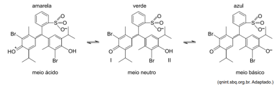 O azul de bromotimol é um indicador ácido-base que pode ter coloração amarela, verde ou azul, dependendo da acidez da solução. O equilíbrio entre as estruturas e as respectivas cores do indicador em meio ácido, neutro e básico é representado a seguir.