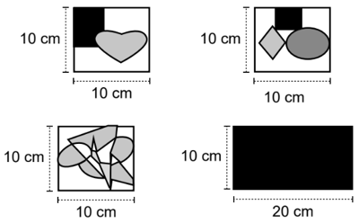 Para confeccionar um tapete em formato retangular de 10 cm × 50 cm, ela utilizará os retalhos, na posição indicada na figura, costurando um lado de um a um lado do outro, sem que haja rotações desses retalhos. O modelo de tapete que pretende confeccionar deverá conter um único retalho de 10 cm × 20 cm e mais três retalhos de formato 10 cm × 10 cm, sendo que retalhos de mesma estampa não poderão ficar lado a lado.