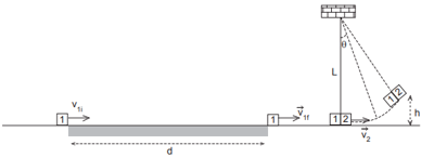 = 6,0 m/s. O bloco 1 sofre então uma colisão totalmente inelástica com o bloco 2, inicialmente em repouso e sustentado por um fio ideal de comprimento L = 1,0 m. O conjunto 1 + 2, logo após a colisão, tem velocidade v₂ = 2,0 m/s e, a partir daí, sobe até uma altura máxima h, como mostrado na figura.